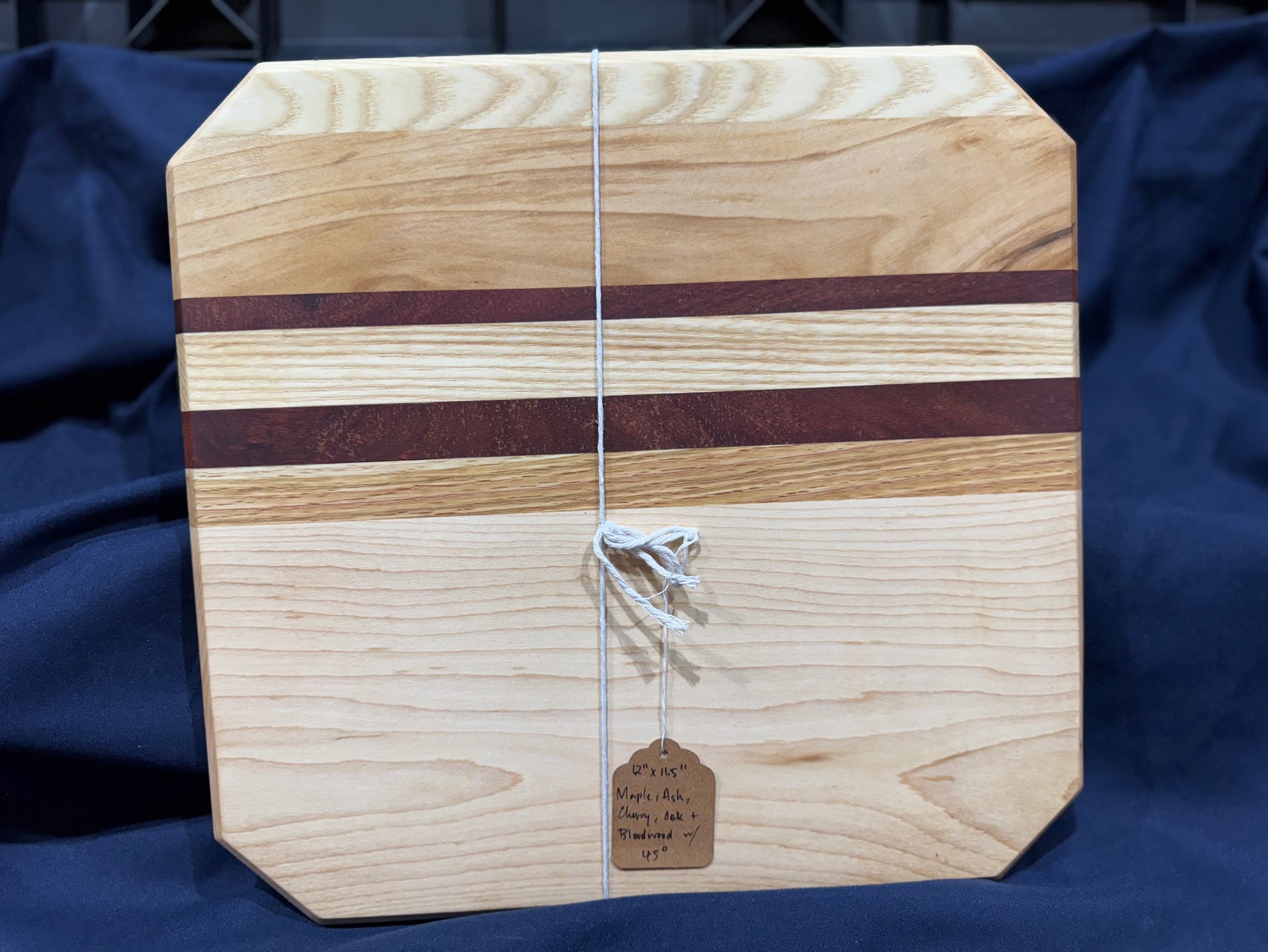 This is a hardwood cutting board made up of maple, cherry, ash, bloodwood with a strip of oak. Finished with a food safe oil.