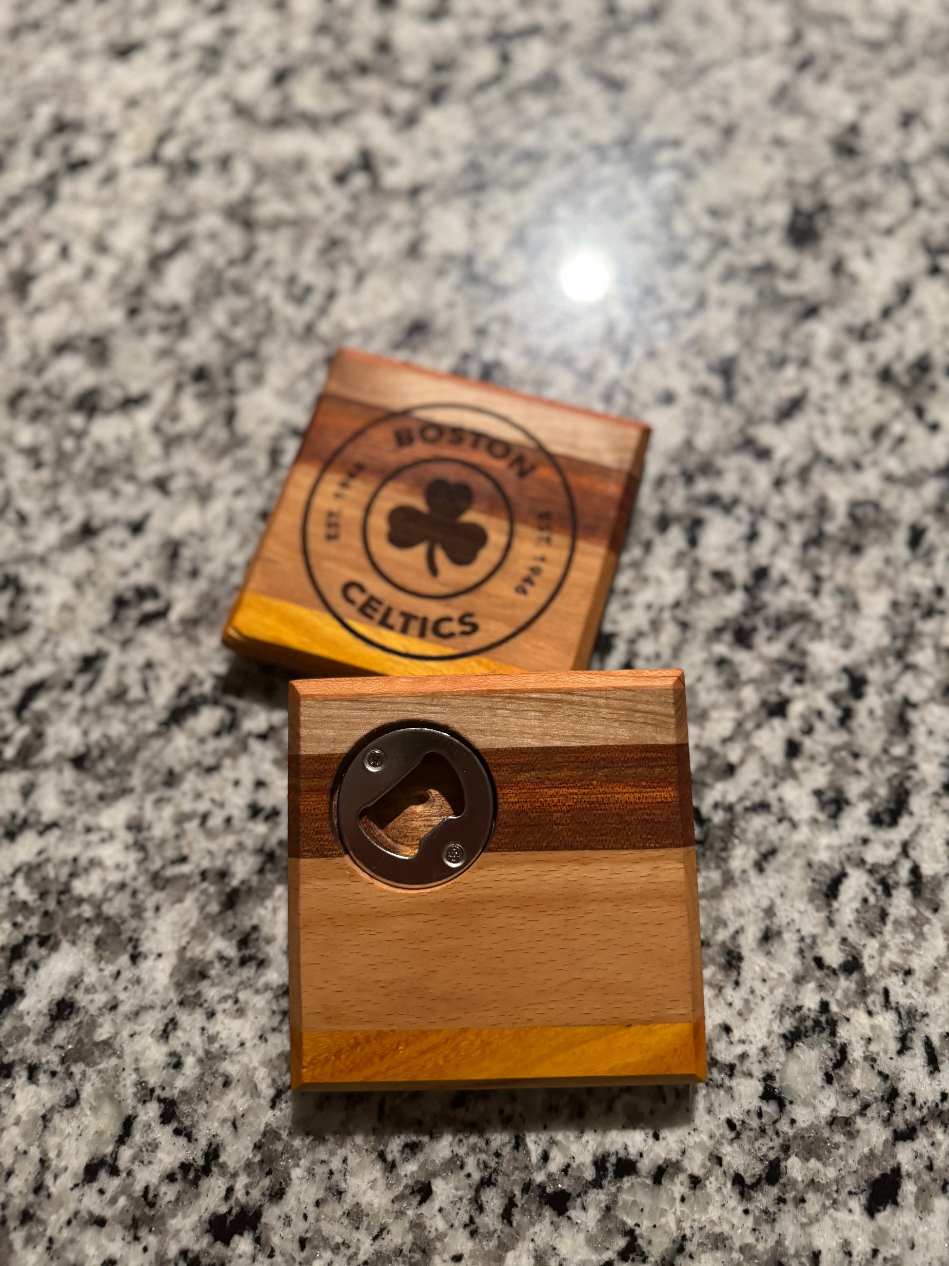 This is a 2 pack coaster set made up of cherry, walnut, Osage, maple and bloodwood. Each coaster has a bottle opener on the back and Boston Celtics engraving. Finished with a food safe oil.