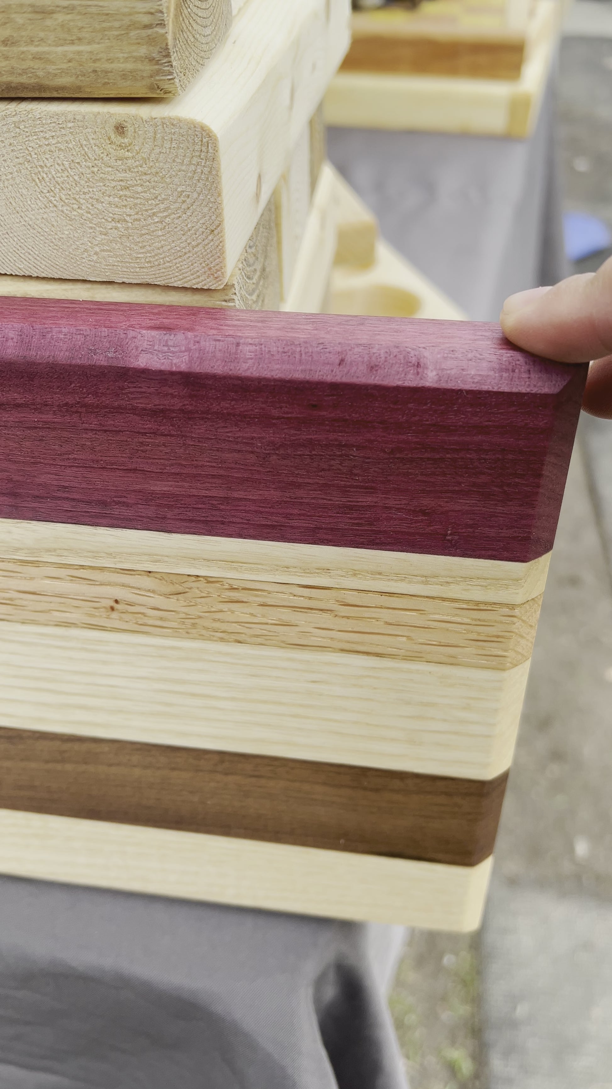 1”x8”x16” cutting board or charcuterie board. Made up of purpleheart, walnut and ash hardwoods. Added a 3/4” chamfer bevel for easy pick up all the way around the board. Finished with a food safe mineral oil