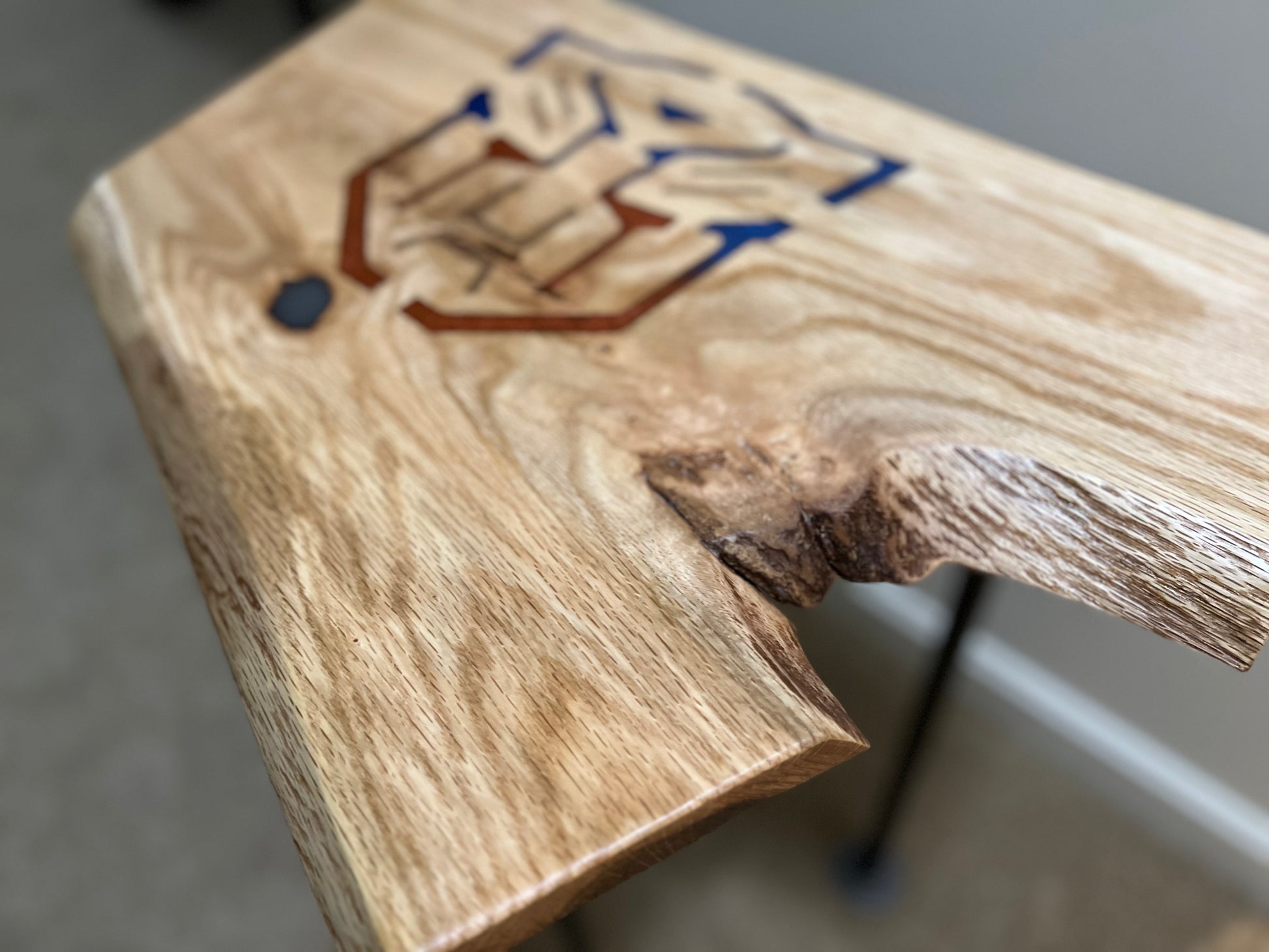 Solid oak live edge side table with a Transformers Autobot inlay. Inlay is filled with epoxy resin. 24” black steel pipe legs. Perfect for a kids room or a movie room