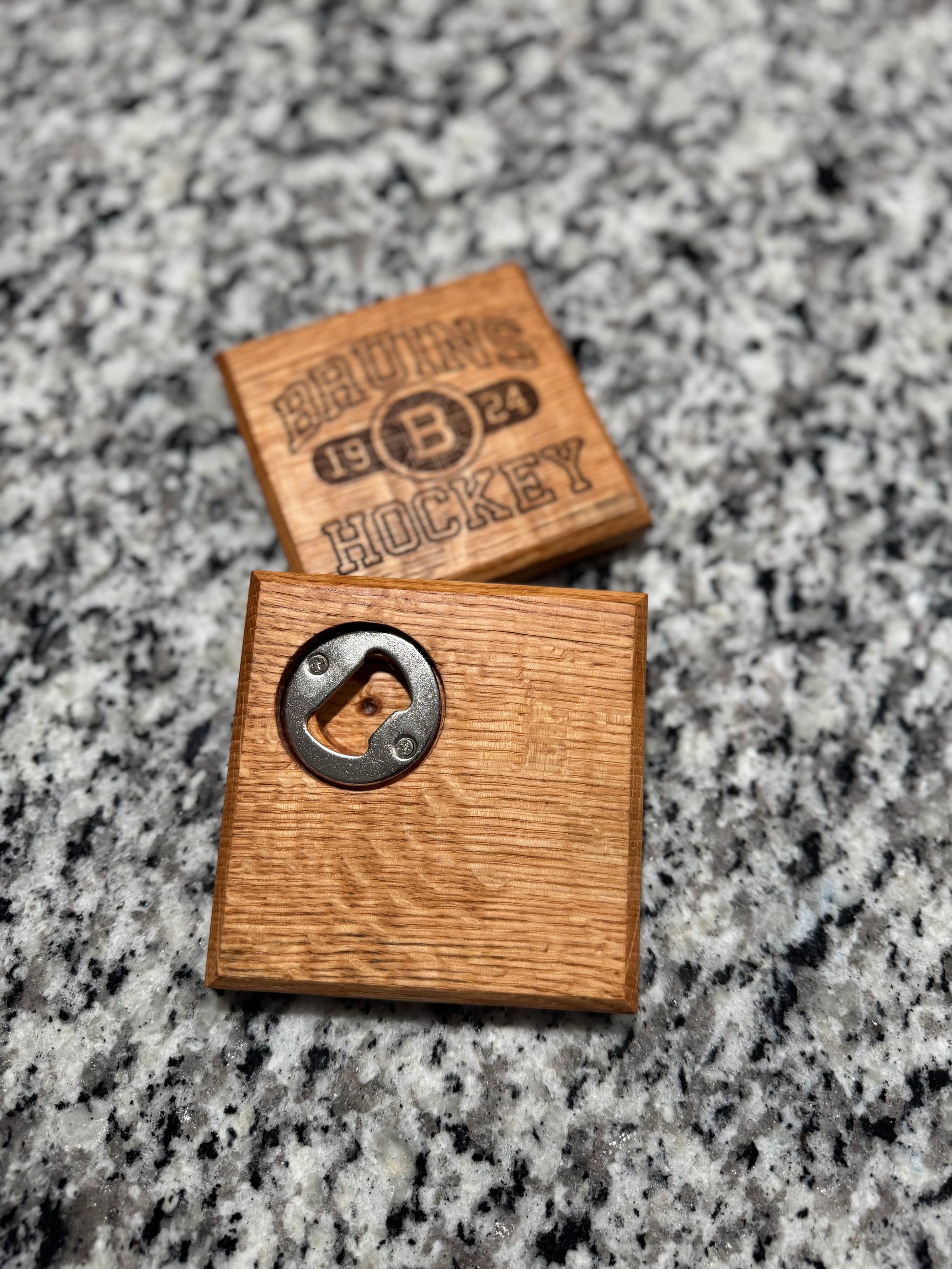This is a 2 pack coaster set with a Boston Bruins hockey engraving. Each coaster has a bottle opener on the back. Finished with a food safe oil