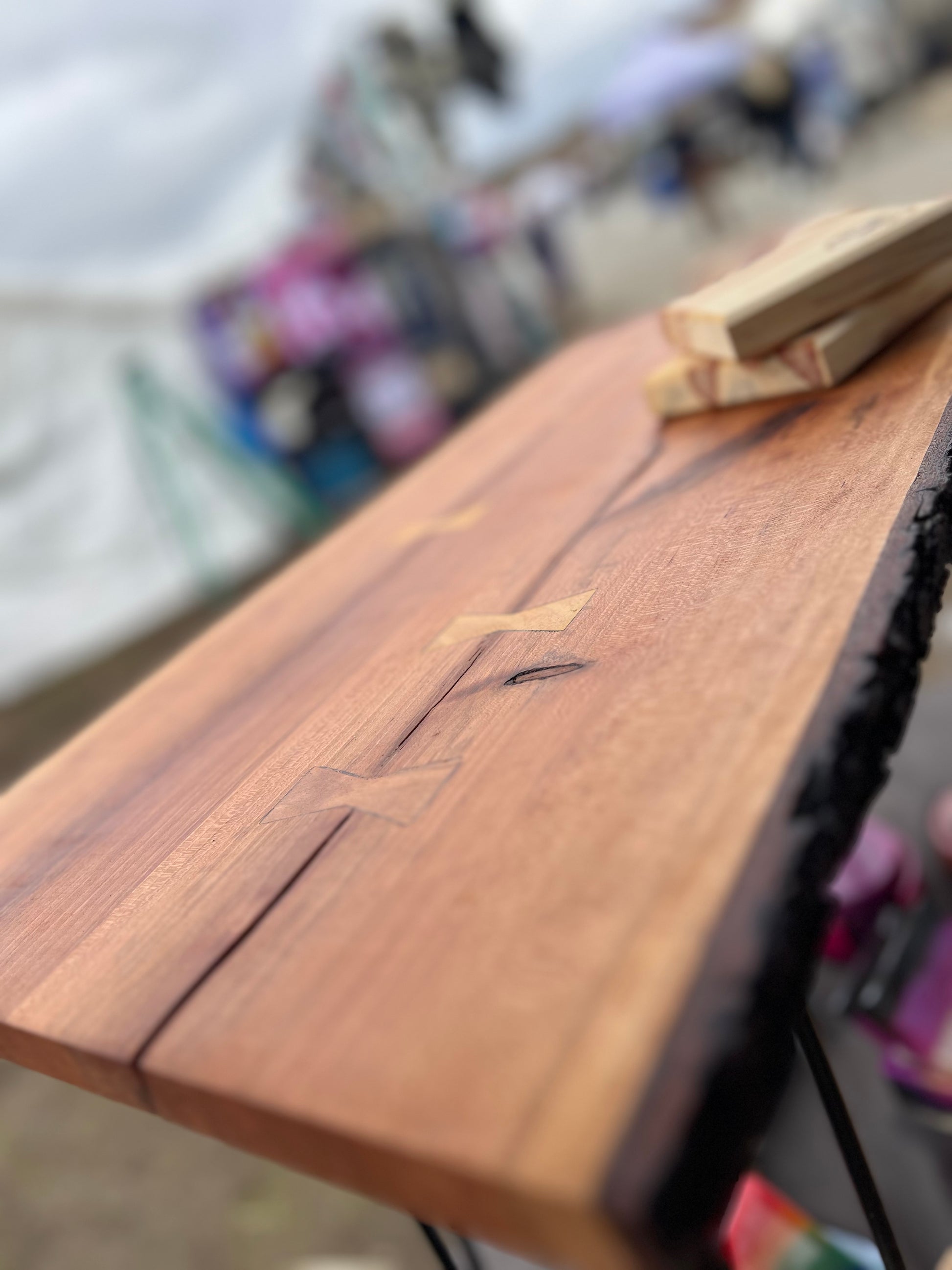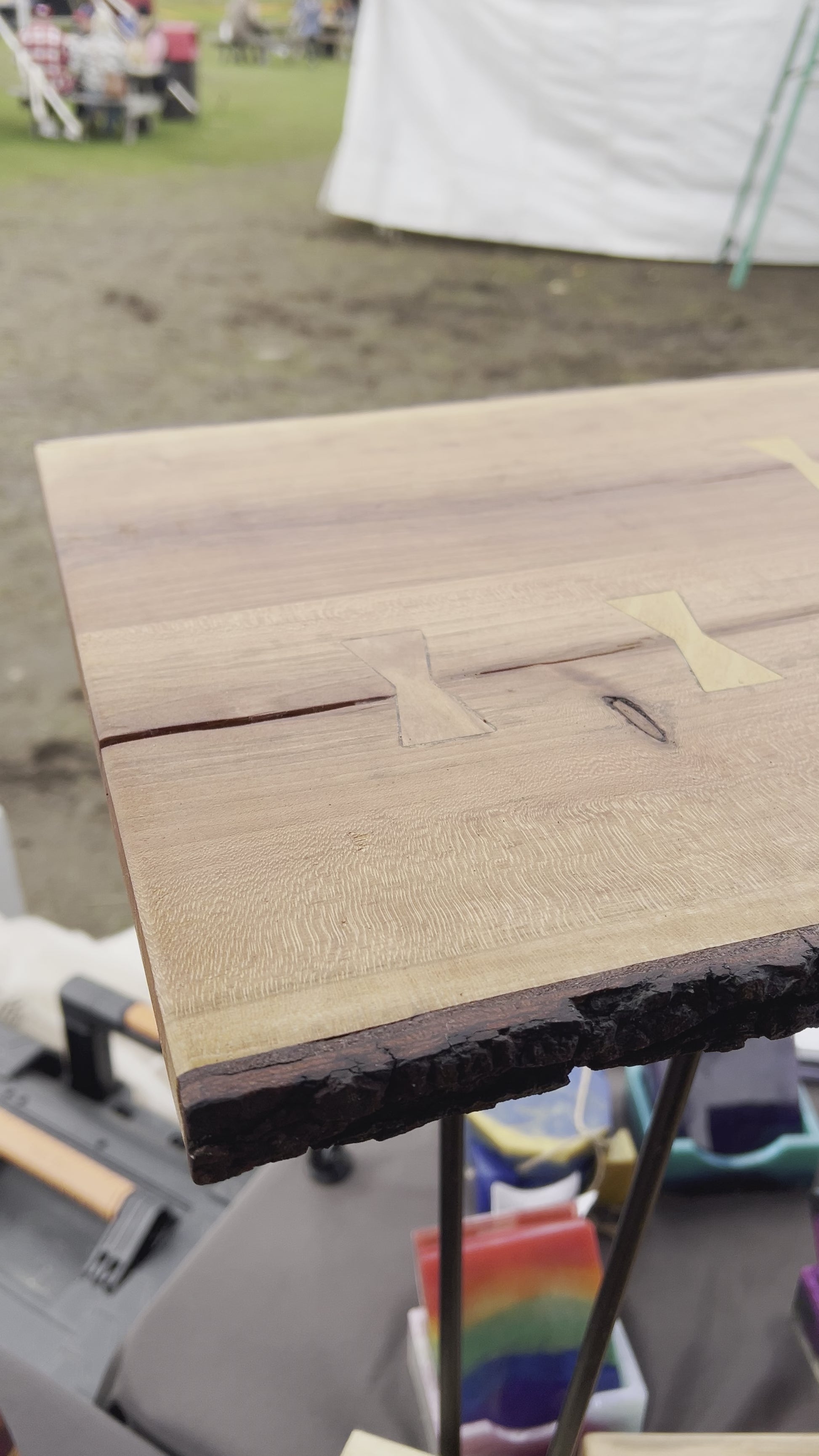 16”x28” small coffee table with 16” metal hairpin legs. Live edge cherry table with Osage and cherry bow tie inlays, finished with furniture oil and conditioner