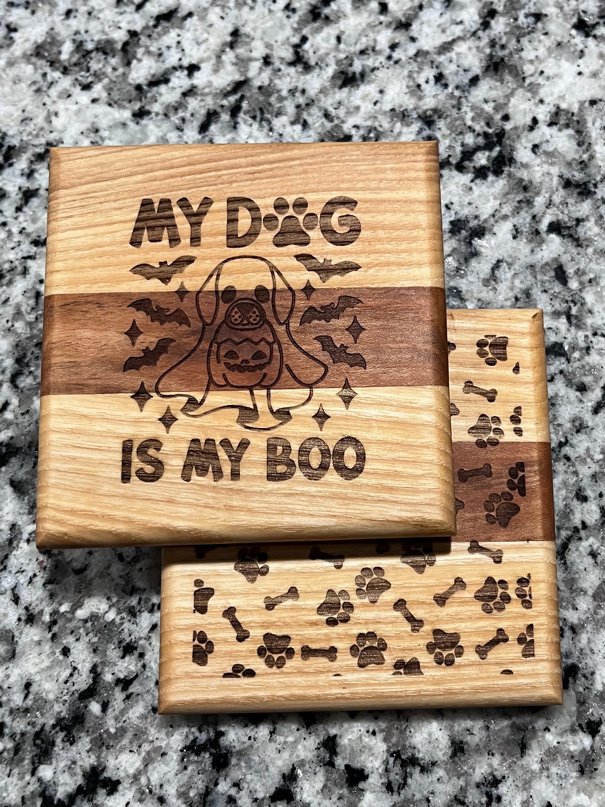 Ash and walnut 2 pack coaster set. One coaster with “my dog is my boo” and the second coaster with bones and paw prints