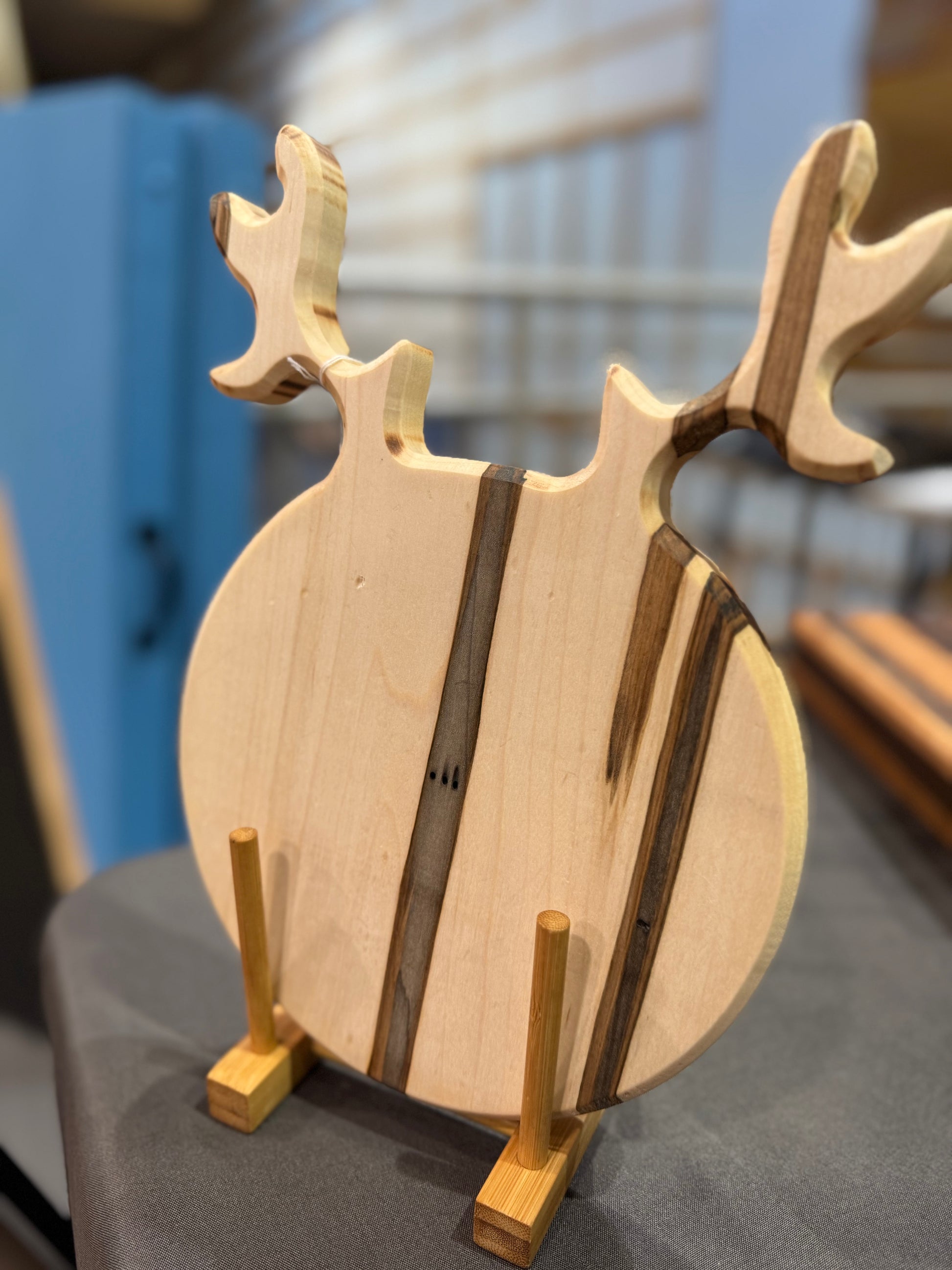Maple ambrosia charcuterie board that has reindeer antlers. It has a 8” round base and is finished with a food safe oil.