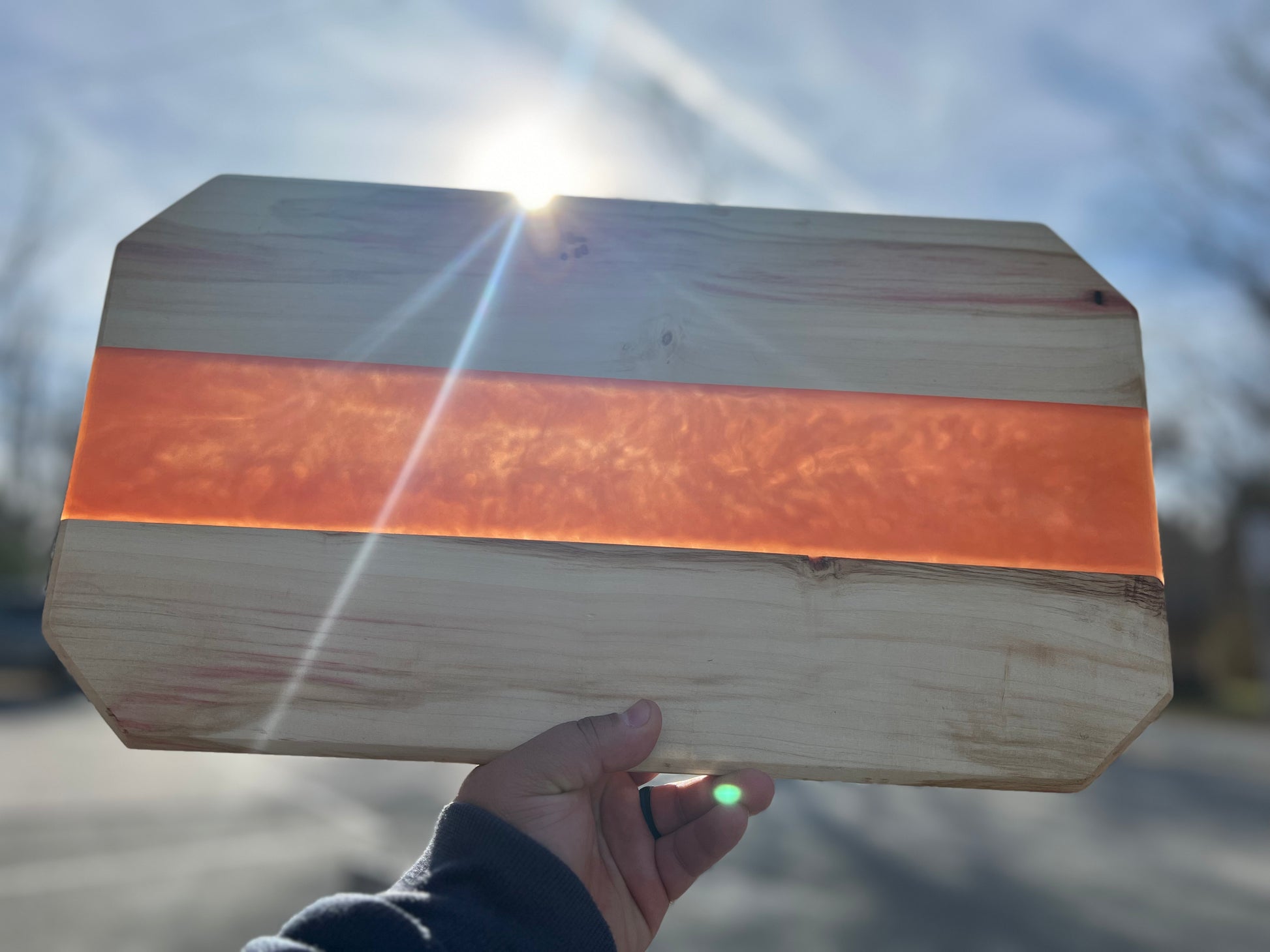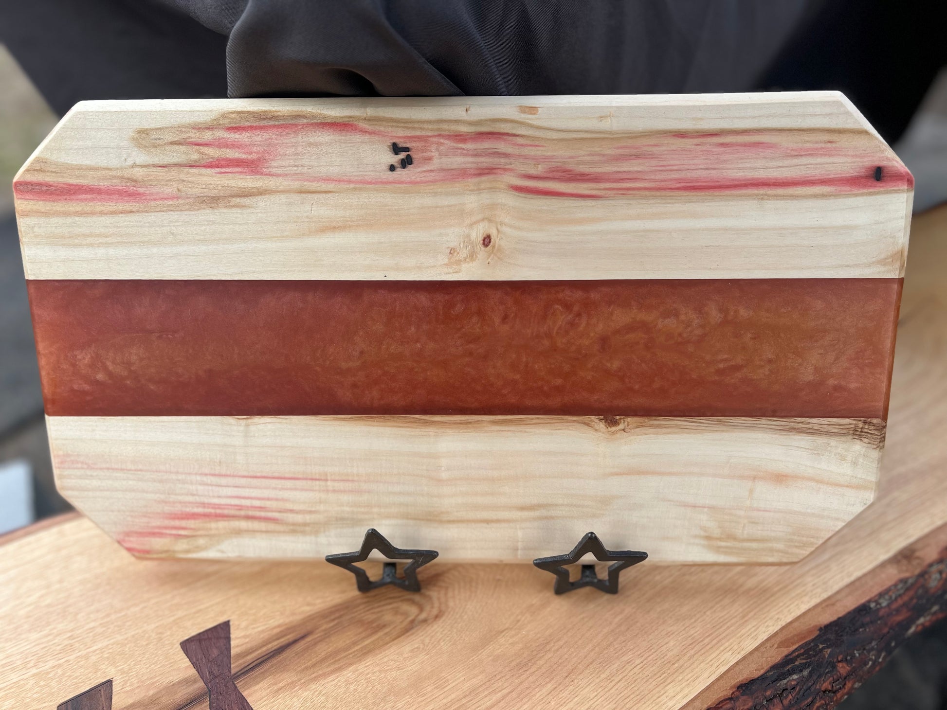 10”x17” charcuterie board made of maple box elder ambrosia. We added a food safe epoxy resin (super clear epoxy) to create a red river look to match the box elder in the maple. We use Black Diamond Pigments to color our resin.