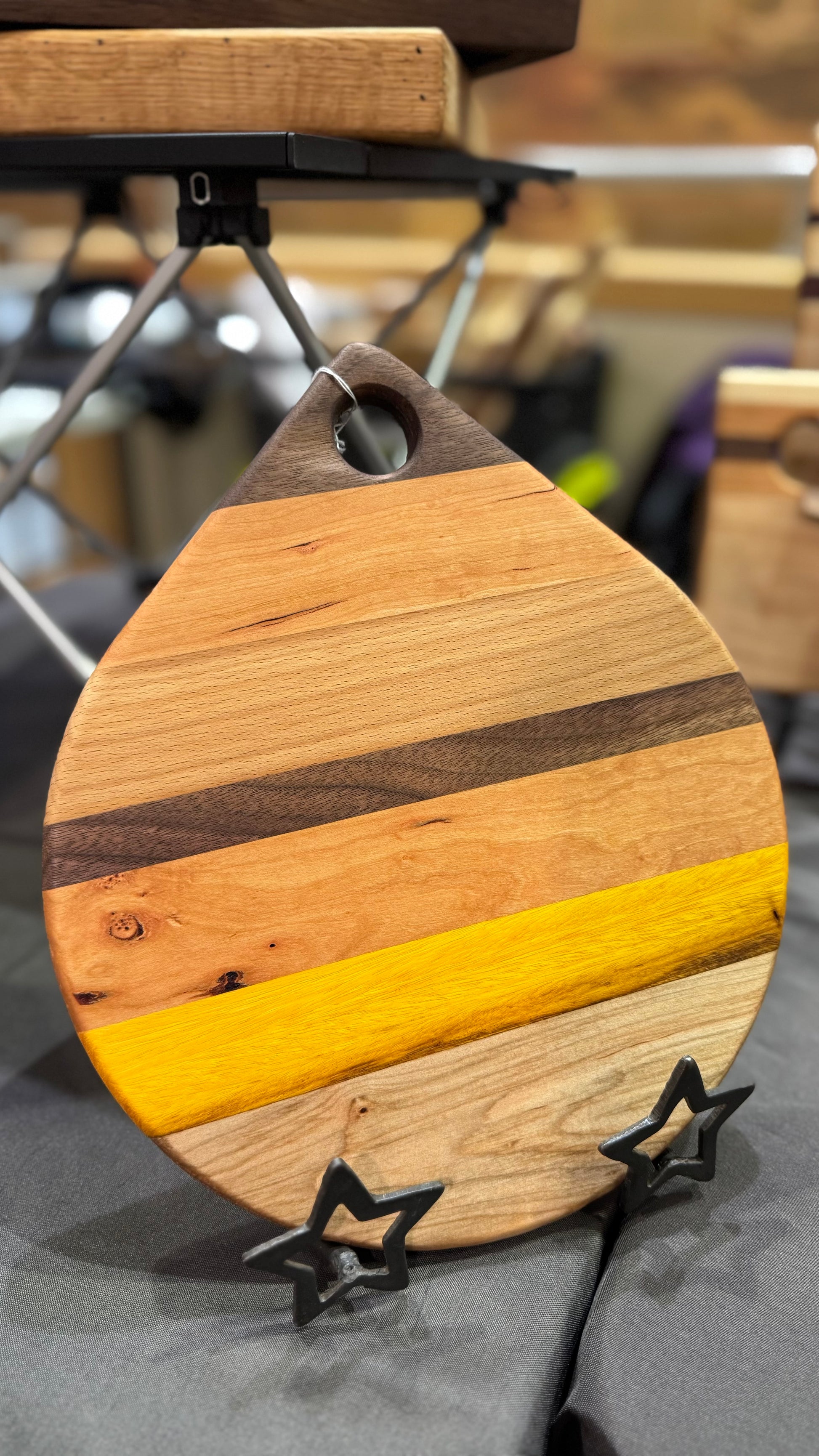 This is a teardrop shaped cutting board with a 9” round base. This board is made up of walnut, maple cherry, Osage and beech. Finished with a food safe oil.