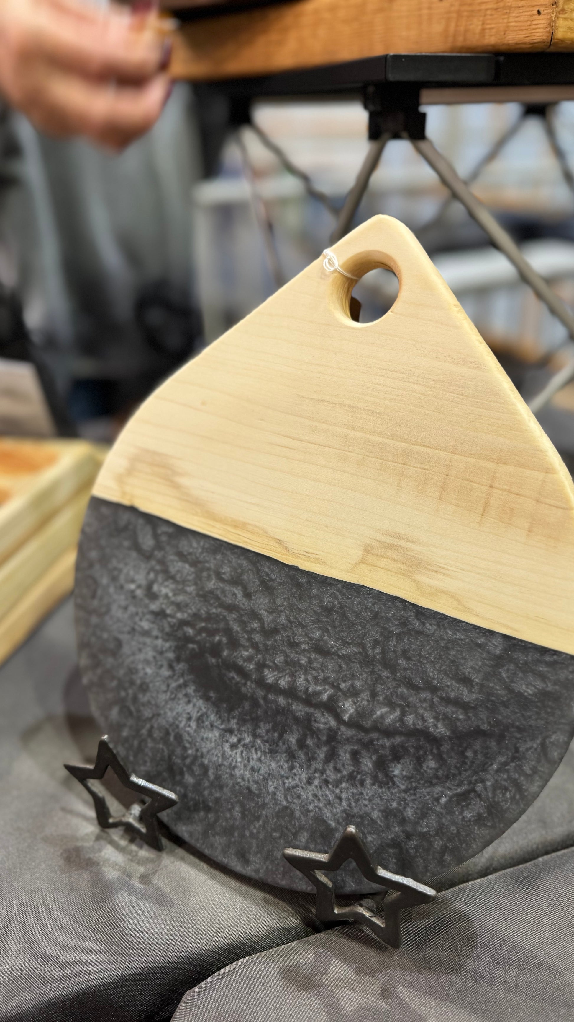 This is a tear drop shaped charcuterie board made out of maple and resin. The resin is food safe and has a silver/metal color to it. The board has a 9” base and is finished with a food oil.