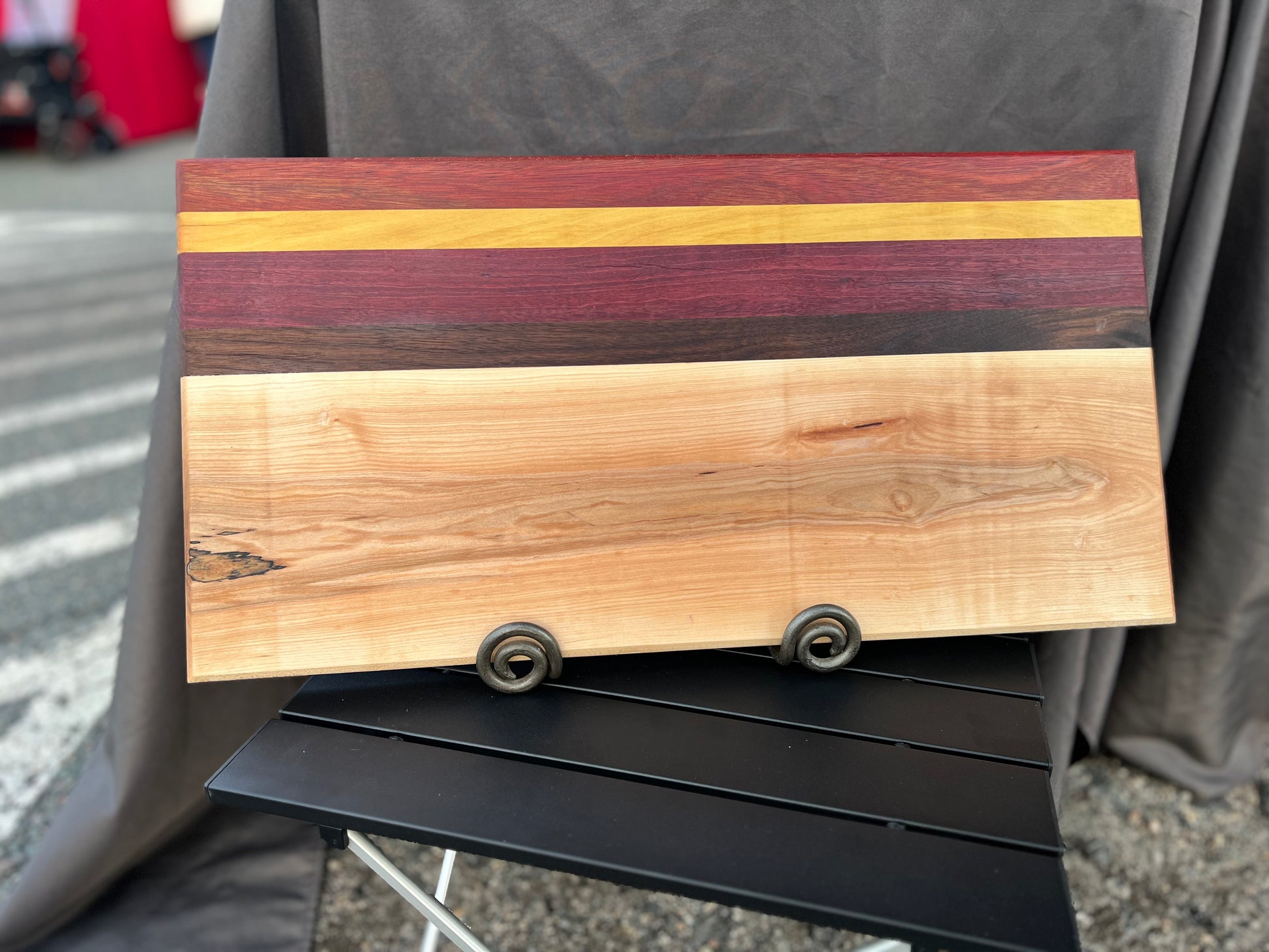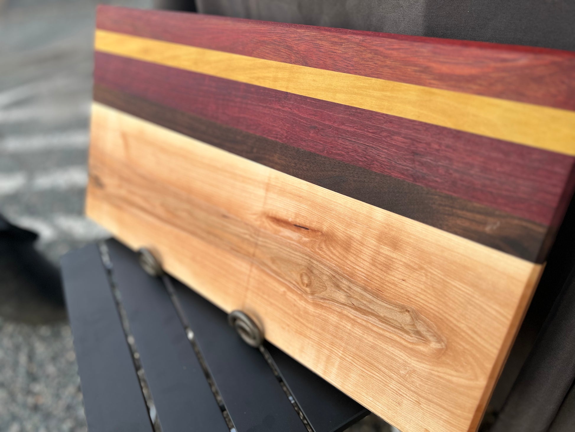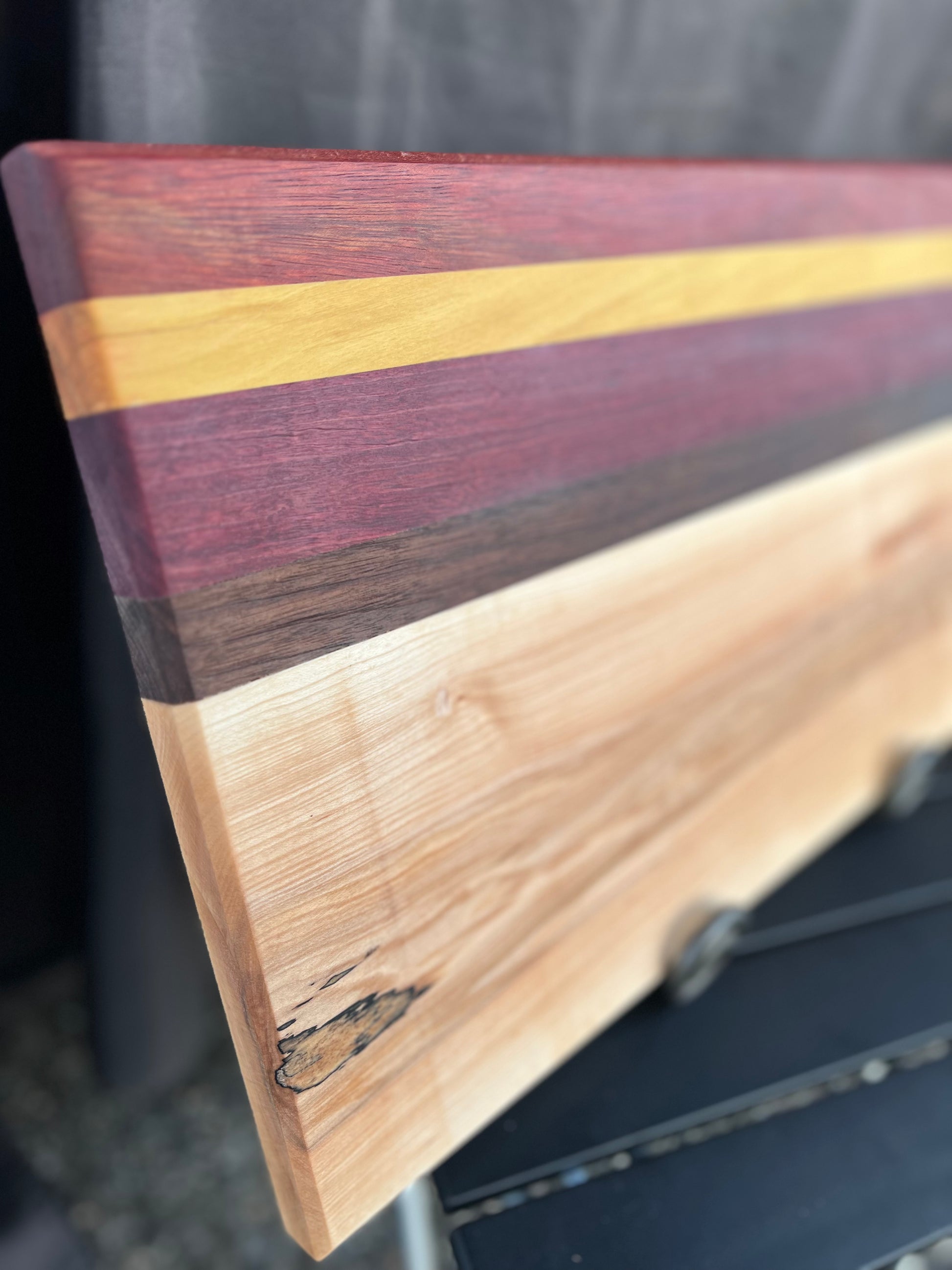 12”x24” massive cutting board made up of bloodwood, yellowheart, purpleheart, black walnut and maple.