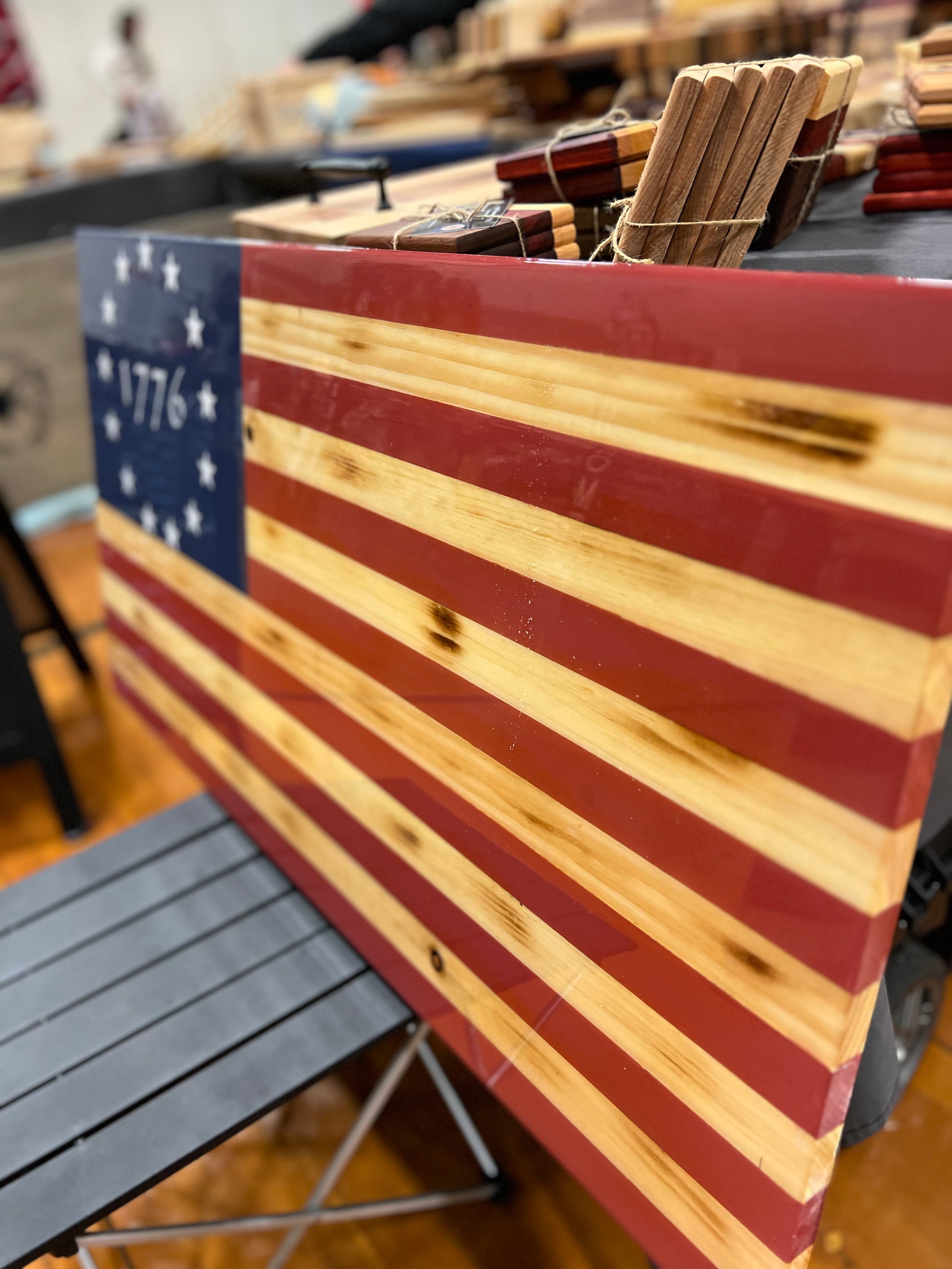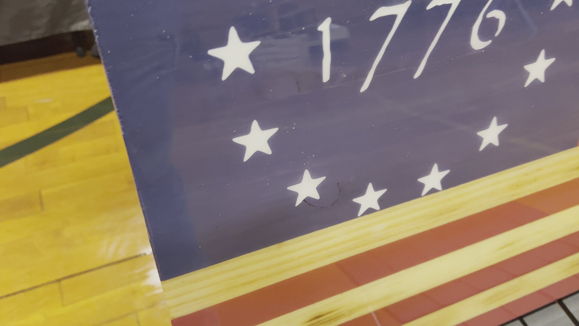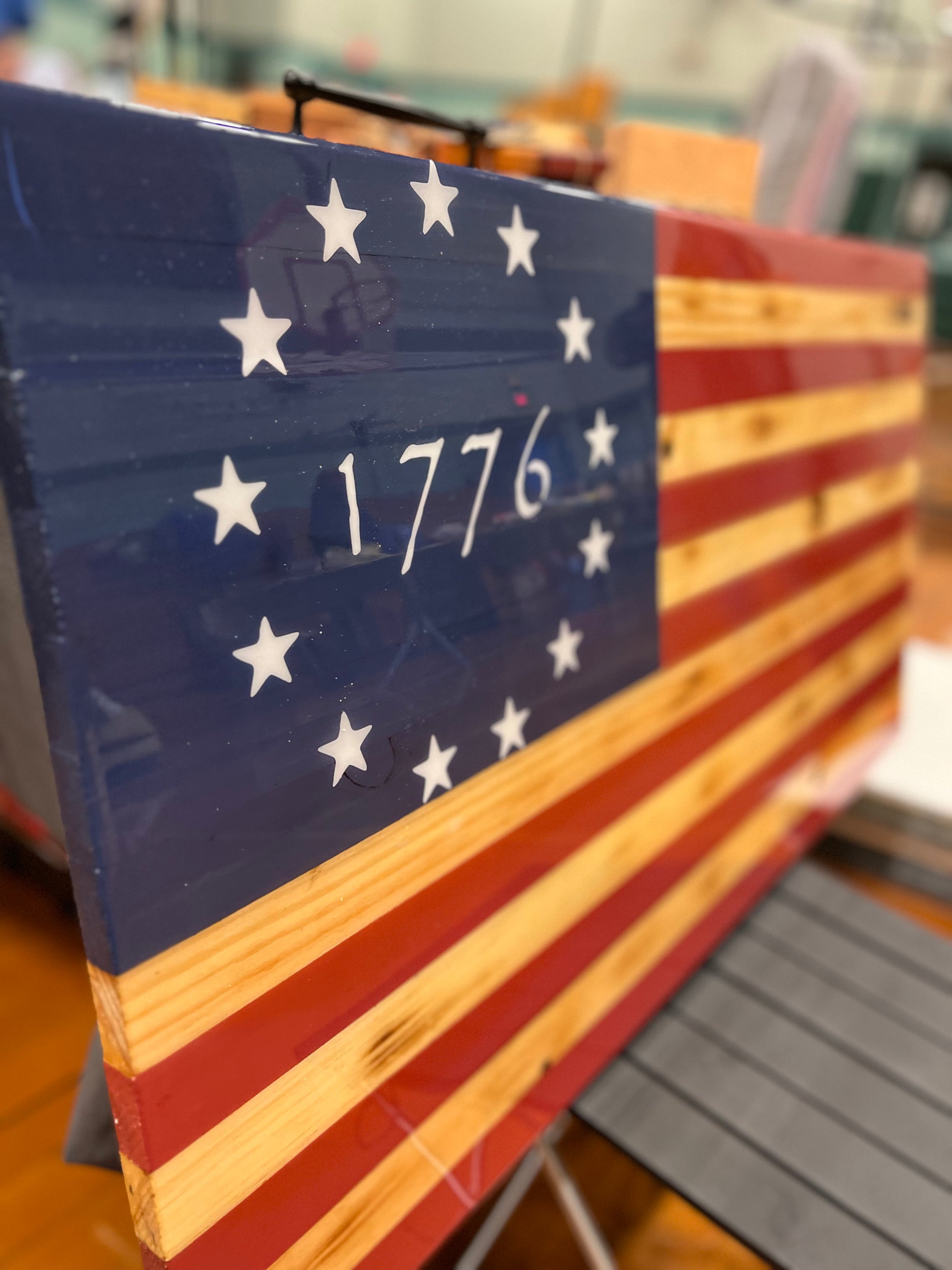 16”x30.5” (Approx.) American flag made of wood with 1776 star pattern made from permanent vinyl decal. Finished with an epoxy table top coating.(Waterproof and UV protection)