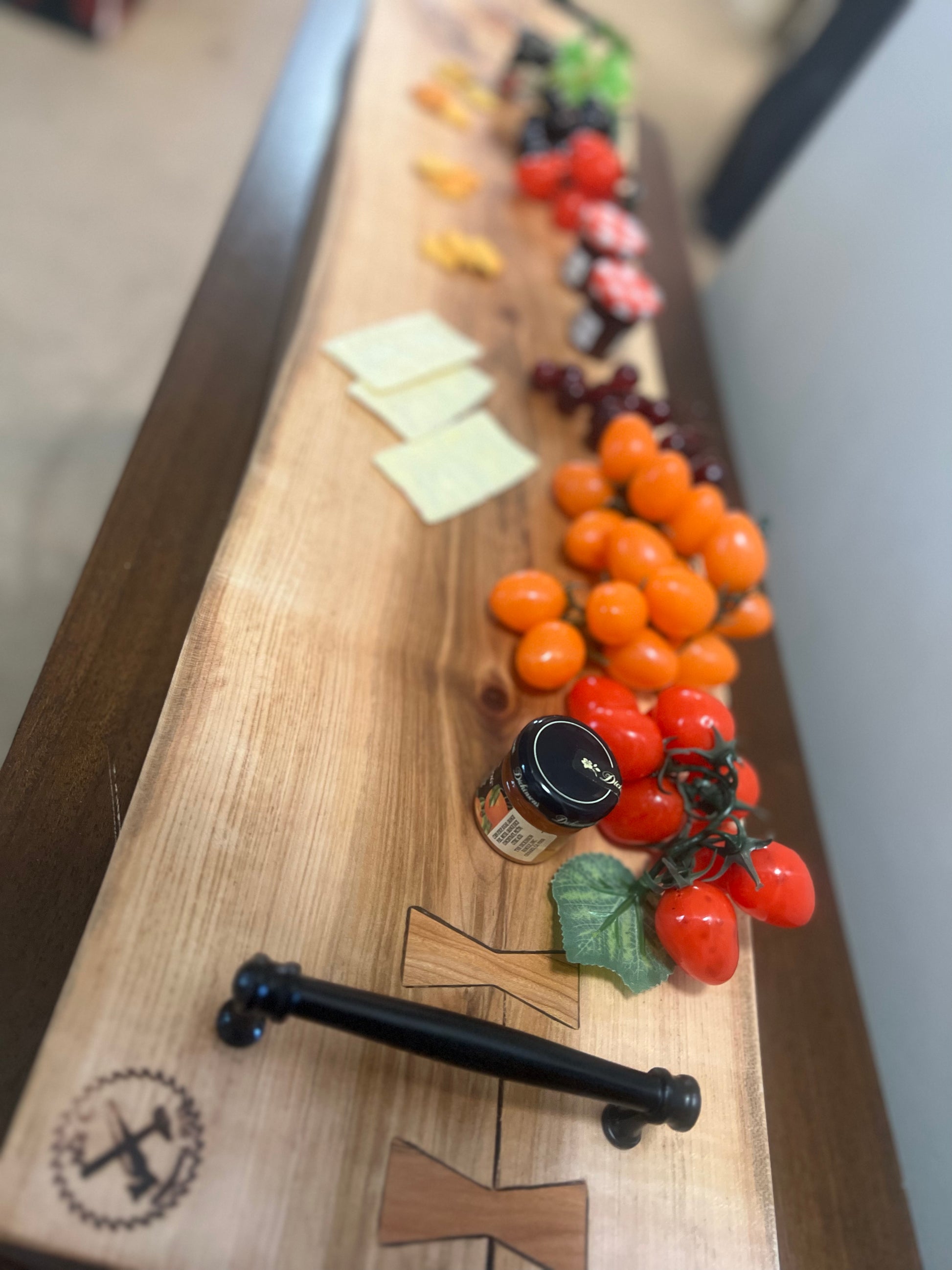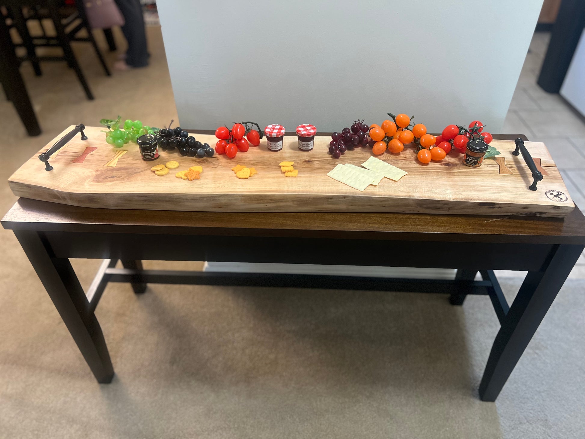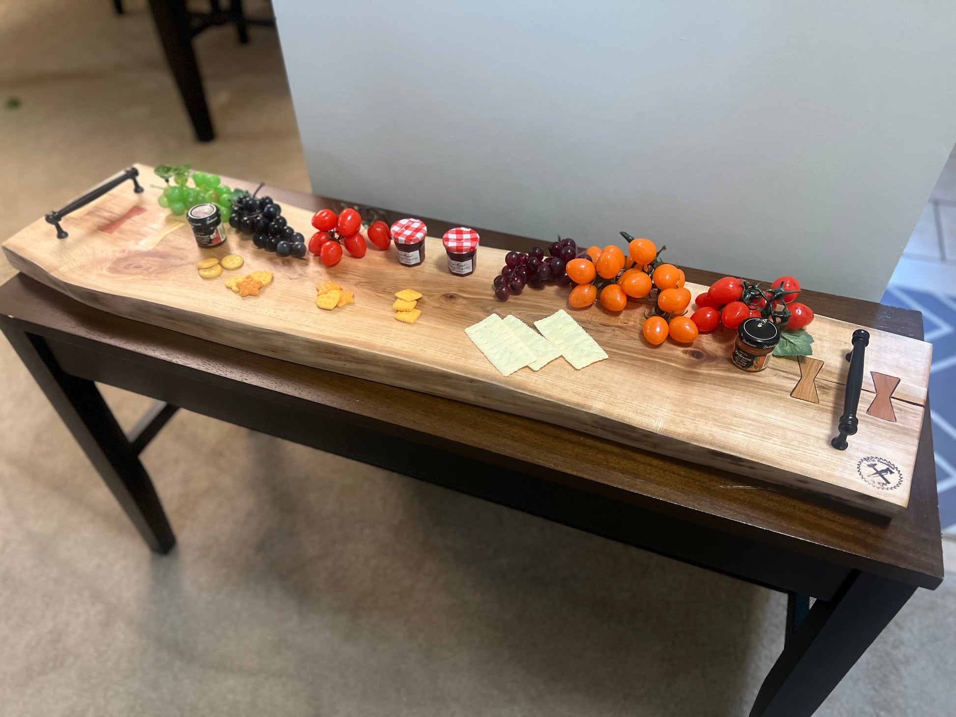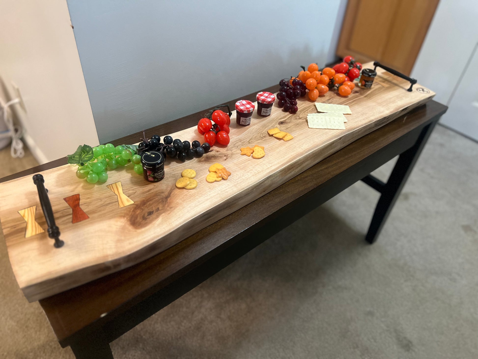 This is a 1.5” thick 4’ maple live edge serving board with 5” black handles for easy carrying. Bow tie inlays for structure and style, made of cherry, paduak and heart pine. Great addition to your home for the ultimate charcuterie display for your gatherings and parties! This board can also fit across your soaker tub, enjoy a relaxing evening with a book and some drinks.